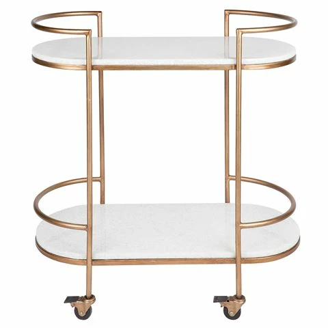 Serve your guests without forgoing function or style. The Southside drinks trolley takes minimalism to the next level, featuring a sleek stainless steel frame in an antique gold finish with inlaid quartz stone. This multi-tiered drinks trolley is as fashionable as it is functional. Rolling casters allow for effortless mobility but lock when a stationary setting is desired.