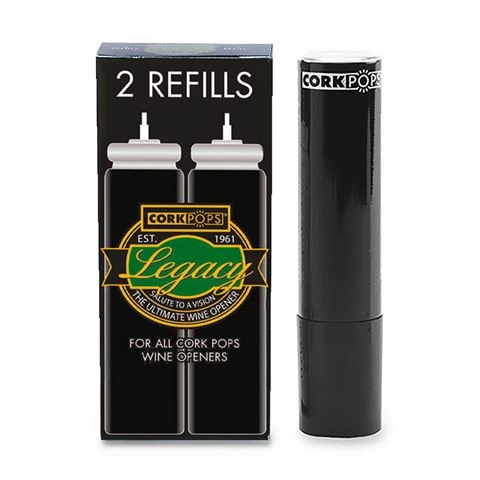 If you’ve already fallen in love with your Legacy Wine Opener, make sure you can keep opening your reds and whites for years to come with these Refill Cartridges. Made in the USA, this pack comes with two Corkpops refills, compatible with all Corkpops Wine Openers. The low pressure in the cartridge gently removes the cork from bottles without affecting the taste of your drink, with each cartridge opening up to one hundred bottles of wine.