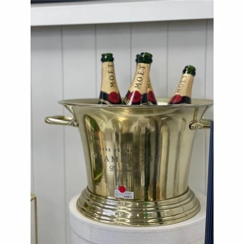 Add an extra touch of luxury when you’re serving champagne with this elegant ice bucket in gold toned metal, which is spacious enough to hold several bottles. Engraved with the name of a champagne house on the front, it sets the scene for celebration.