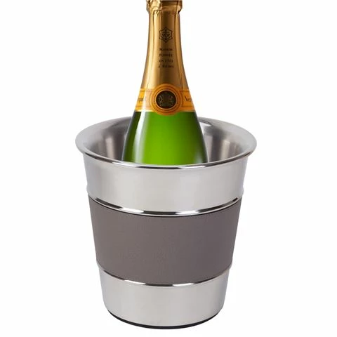 This sleek and elegant champagne bucket is essential for any gathering. It’s deliciously low key with its steel and leather banded exterior – a touch art deco with a very modern twist. The truncated cone silhouette features a flared brim, while the polished steel structure is insulated to keep the bottles beautifully chilled.