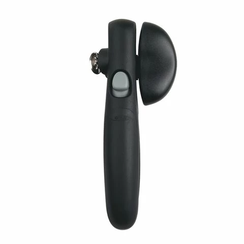 Squeeze it closed and hear the lock snap shut. The Can Opener will hold the can as you turn the knob, so you don’t need to grip tightly. Press the lock open with your thumb to release the can.