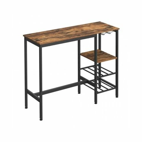 The Simplicity Living Bar Table with Wine Glass Holder and Bottle Rack features a shelf, 2-tier bottle rack, and 2 glass holders, all raised by a black steel frame and particleboard panels for a captivating industrial style.